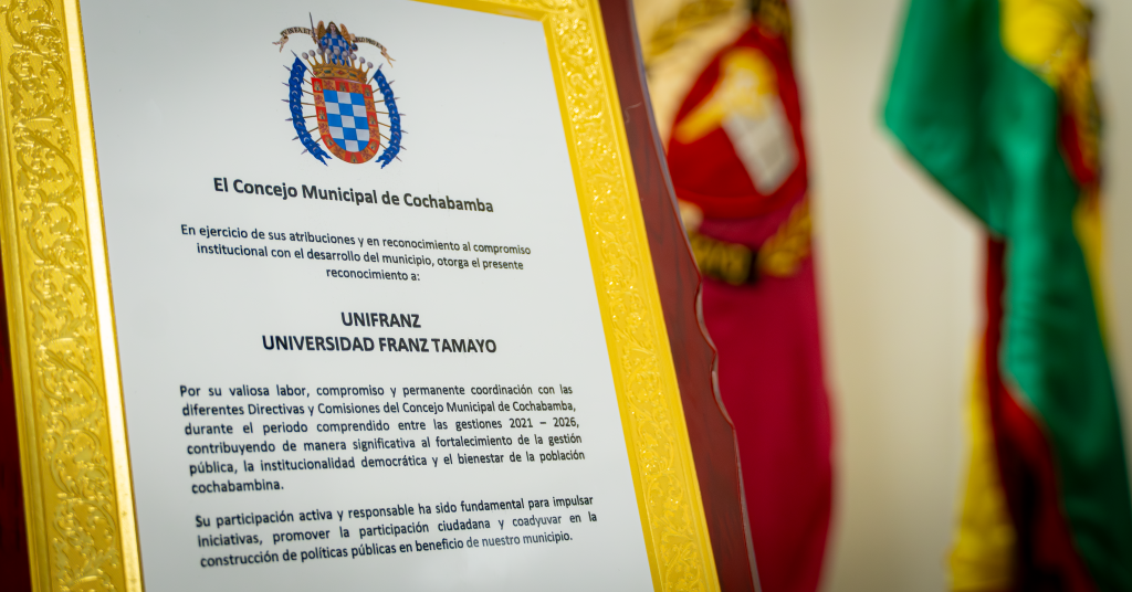 El Concejo Municipal distinguió a la Universidad Franz Tamayo (Unifranz) por su aporte sostenido y estratégico en el desarrollo del municipio entre 2021 y 2026. Al terminar la gestión legislativa, el órgano deliberante hizo un balance y decidió reconocer a las instituciones que más contribuyeron a hacer que Cochabamba pueda desarrollarse y avanzar en el liderazgo como ciudad más humana e inteligente.