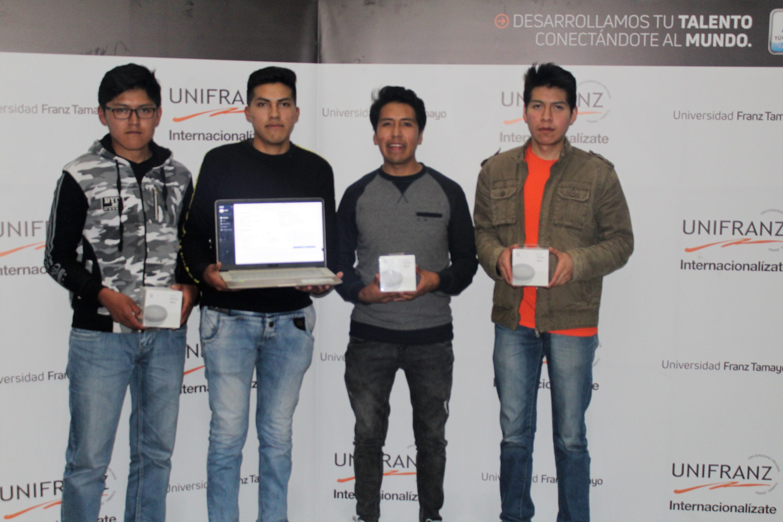 Los integrantes del equipo de UNIFRANZ son: Marcial Cahuaya Tarqui y Daniel Cruz Calani, egresados UNIFRANZ; Deynar Adir Mamani Tangara y Martin Sinka Castillo, estudiantes UNIFRANZ.