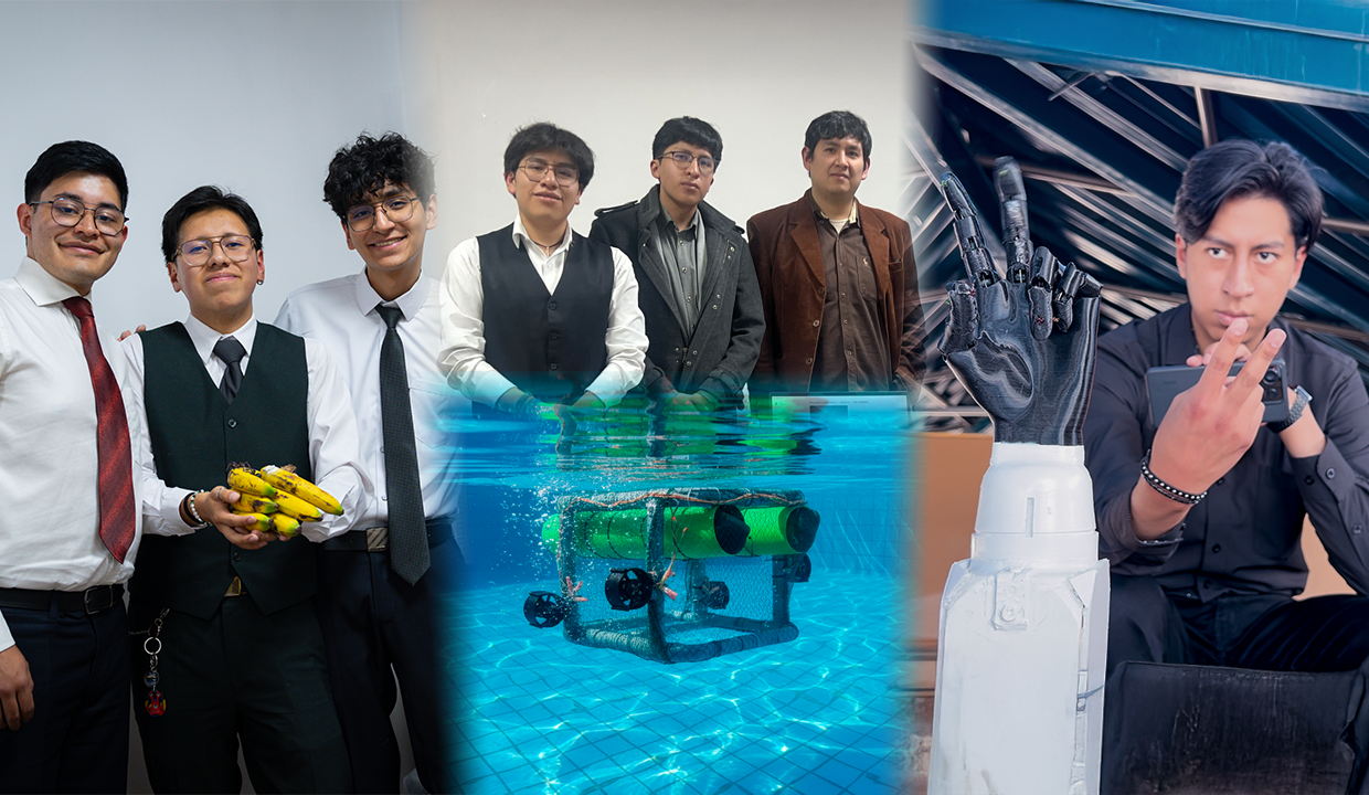 Una de las iniciativas más destacadas es la prótesis de mano electrónica inteligente, desarrollada por el estudiante egresado Ronald Uriel Choque Paco. “El proyecto es una prótesis de mano electrónica que utiliza el acto de la imitación para generar sus movimientos. Como sabemos, la imitación está presente en nuestro día a día, ya que nosotros observamos algún movimiento y lo reflejamos en nuestro comportamiento o movimiento”, sostiene Ronald.