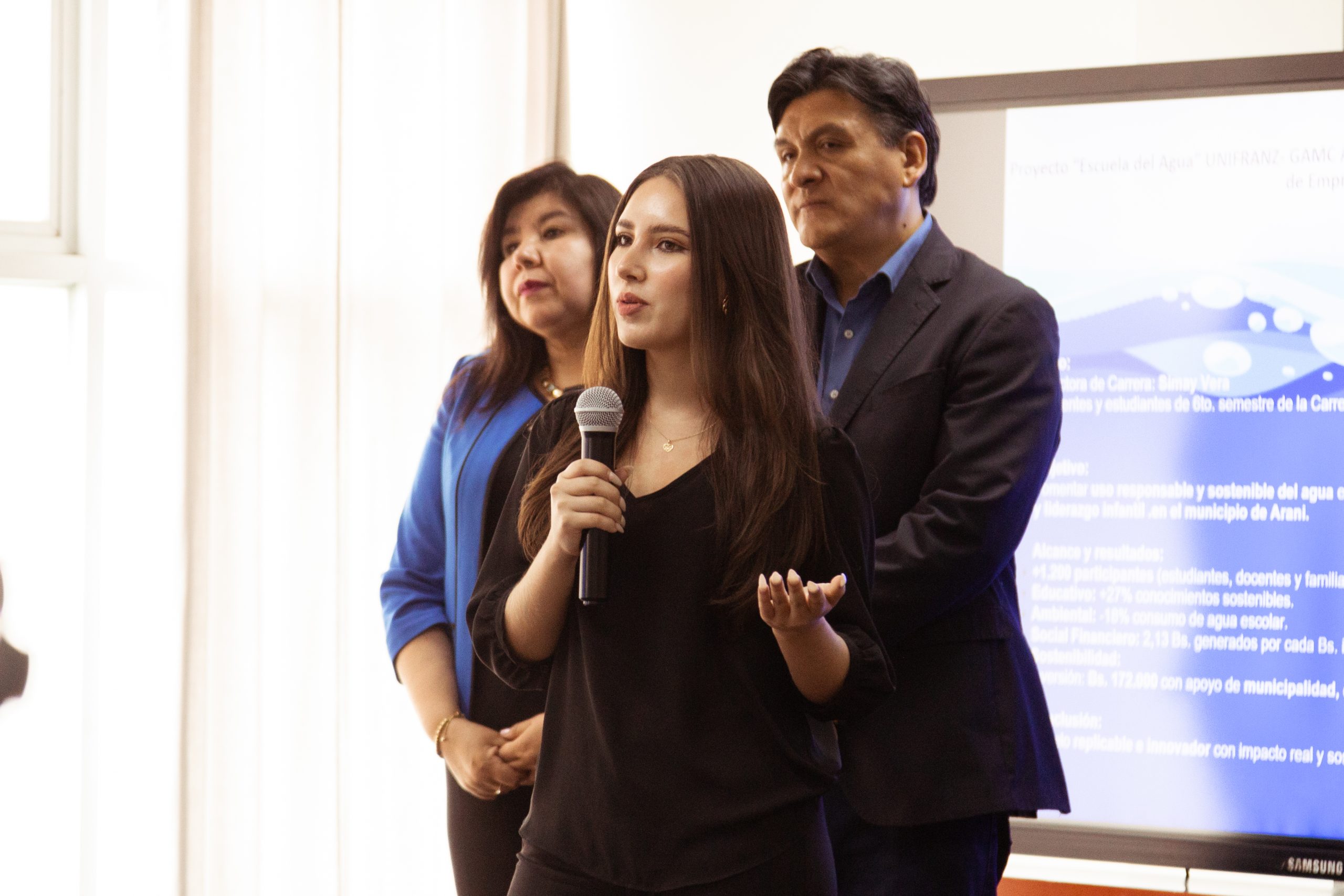 Durante su exposición, Mirtha Vargas, directora de la carrera de Derecho de Unifranz Cochabamba, explicó que la universidad promueve un modelo de aprendizaje orientado a la acción y la responsabilidad ambiental. “Cada gota cuenta. El futuro del agua está en nuestras manos. Inspiramos acción colectiva y aprendizaje con sentido”, expresó.