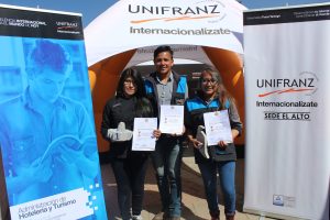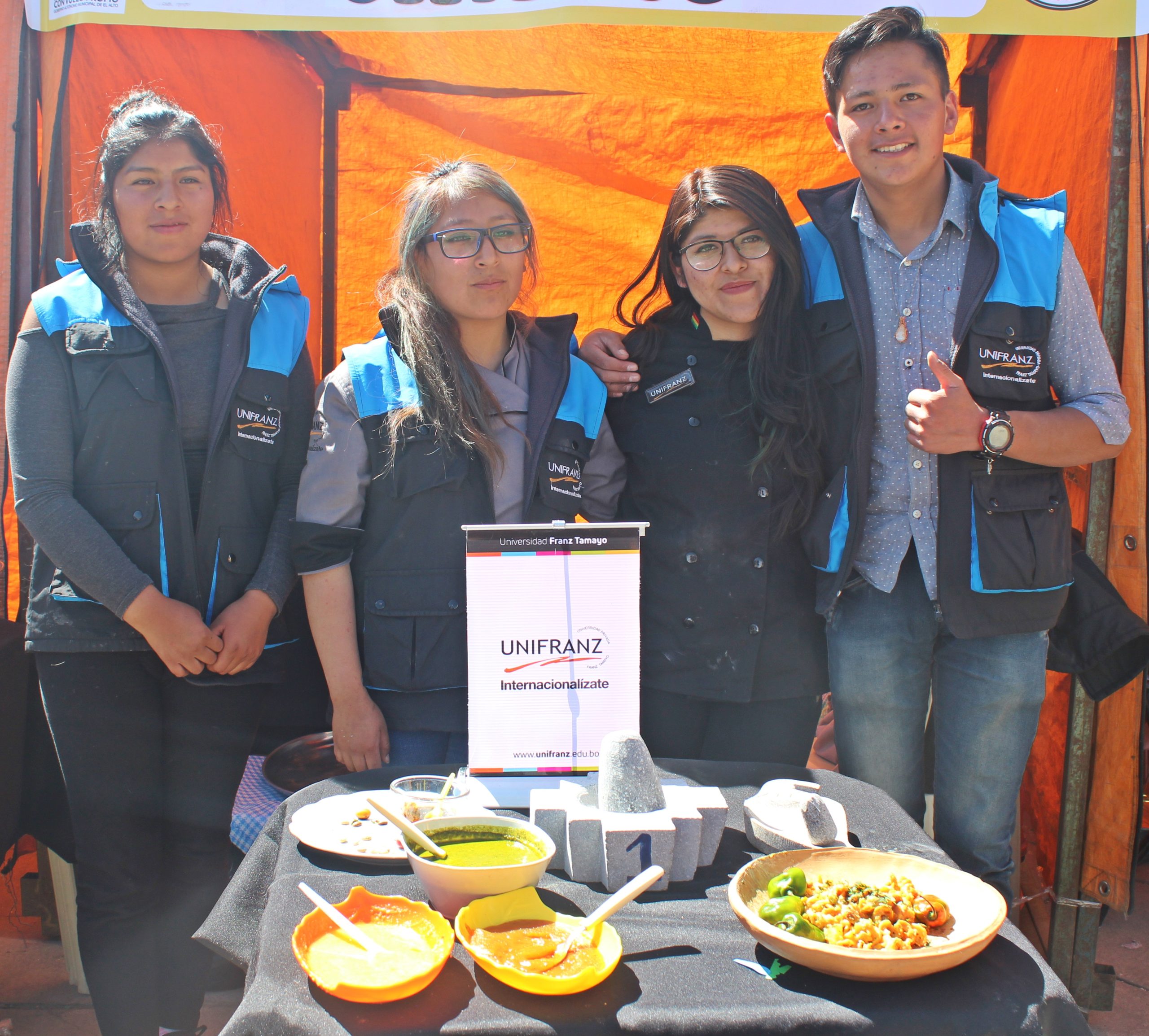 El Alto. Agosto. Con el propósito de desarrollar su creatividad gastronómica y aportar al fortalecimiento de la identidad culinaria alteña, estudiantes de la Carrera de Administración de Hotelería y Turismo UNIFRANZ participaron de la “Cuarta Feria de la Llajua” organizada por el GAMEA y lograron, por segundo año consecutivo, ganar el Primer Premio (la Estatuilla de Locoto) de las salsas picantes con una “Llajua de Naranja”, reconocimiento logrado por la fusión, innovación y explosión de diferentes sabores. También ganaron el premio al Mejor “Ají de Fideo de Altura”.
