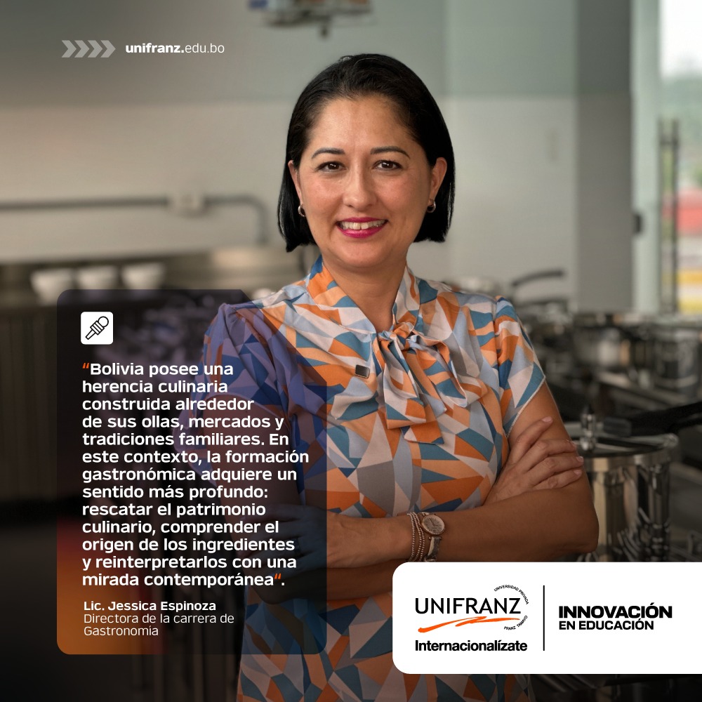“Bolivia posee una biodiversidad única y una herencia culinaria construida alrededor de sus ollas, mercados y tradiciones familiares. En este contexto, la formación gastronómica adquiere un sentido más profundo: rescatar el patrimonio culinario, comprender el origen de los ingredientes y reinterpretarlos con una mirada contemporánea”, destaca Jessica Espinoza, directora de la carrera de Gastronomía y Artes Culinarias de Unifranz, sede Santa Cruz.