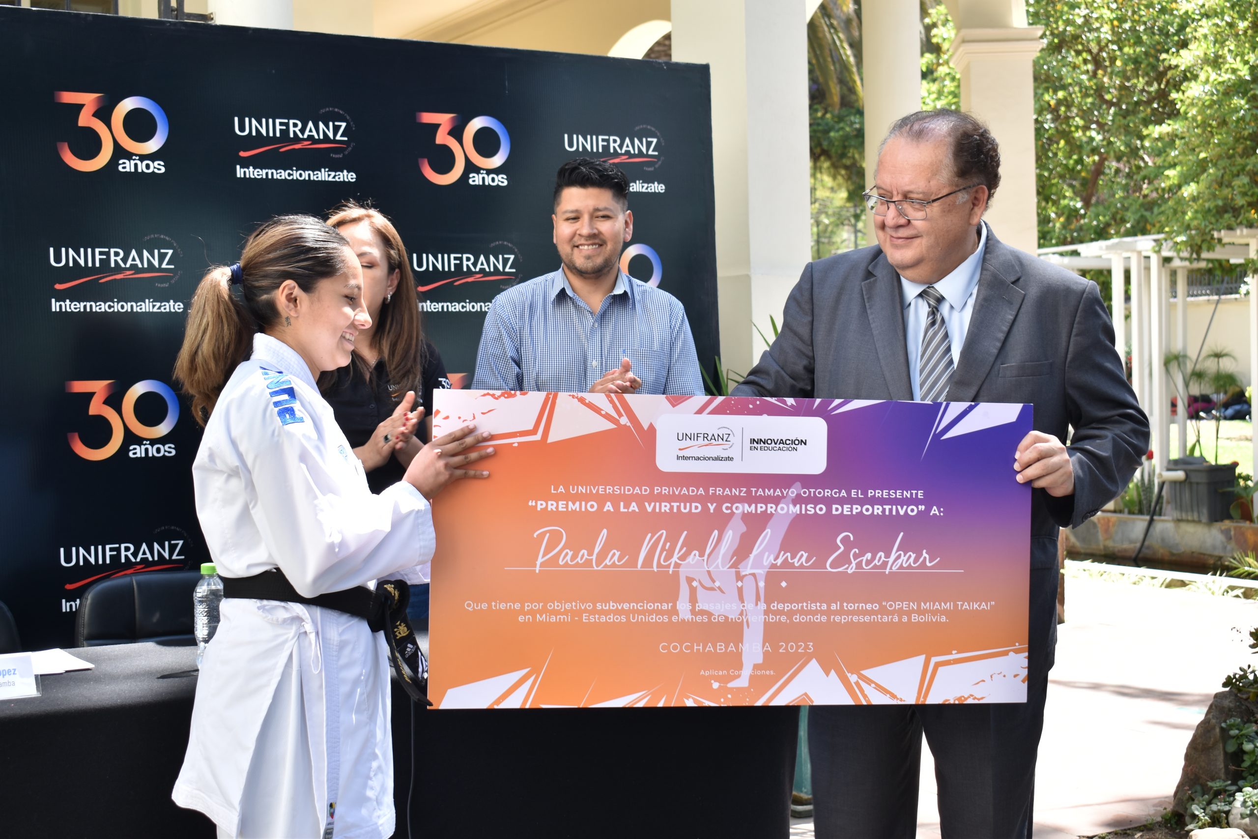 Unifranz, con una visión centrada en el fomento del talento exponencial y la formación de brindó su apoyo a esta joven promesa. Proporcionó a Paola los pasajes de ida y vuelta a Miami para que pueda continuar desarrollando su disciplina deportiva. Estudiantes y trabajadores de la universidad también contribuyeron con aportes voluntarios para financiar su estadía en el extranjero.