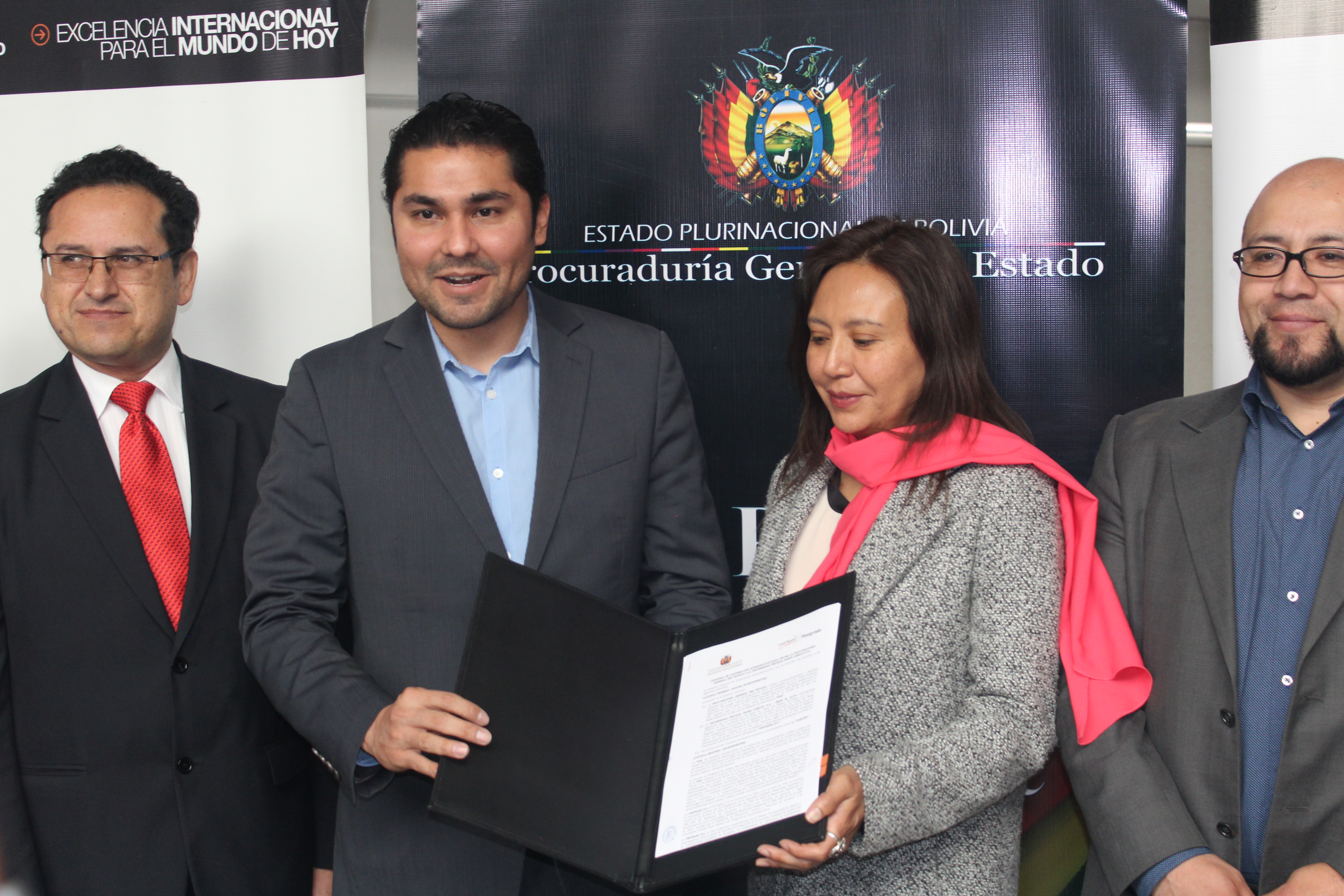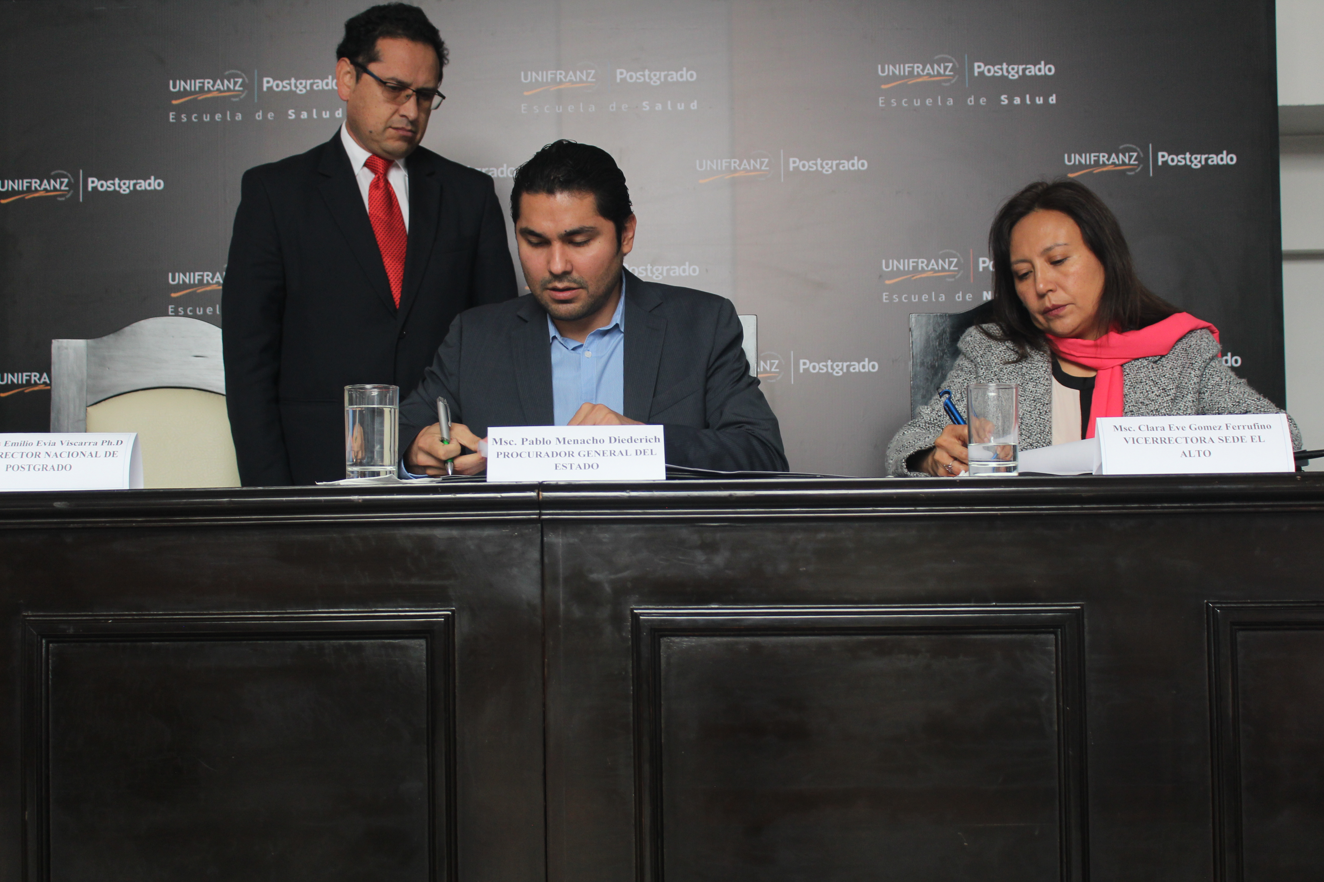 El Alto. Septiembre. Con el objetivo de fortalecer la formación de abogados, constitucionalistas y especialistas en Derecho, la Procuraduría General del Estado, mediante la Escuela de Abogados del Estado “Evo Morales Ayma”, y la Facultad de Postgrado de UNIFRANZ firmaron un Convenio de Cooperación Interinstitucional con el objetivo de implementar programas de formación académica como Diplomados, Especialidades, Maestrías y Doctorados relacionados con temas de Arbitraje Internacional, Defensa Legal del Estado, Derechos Humanos y Medio Ambiente; beneficiando mayormente a  profesionales que trabajan en entidades dependientes del Estado.