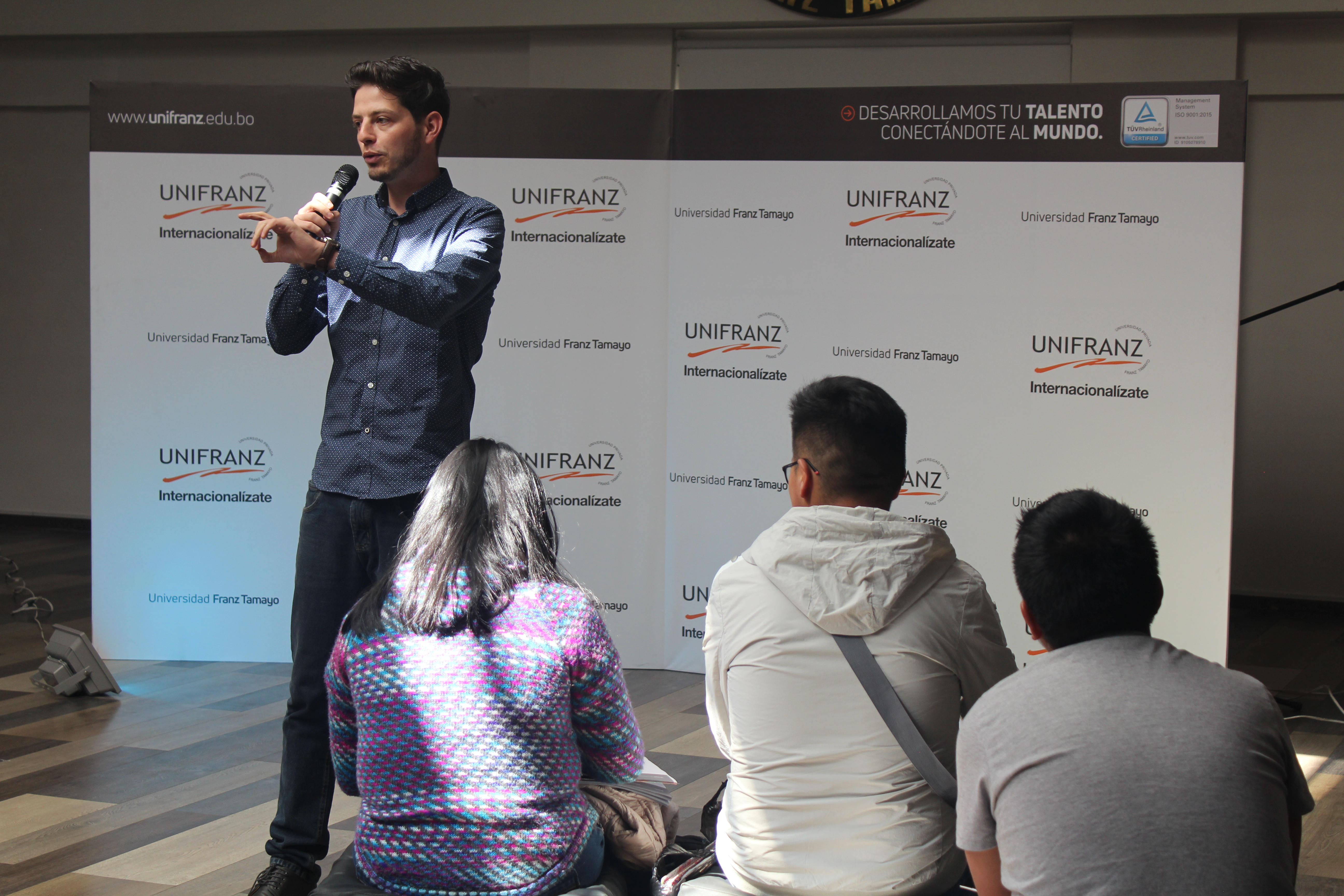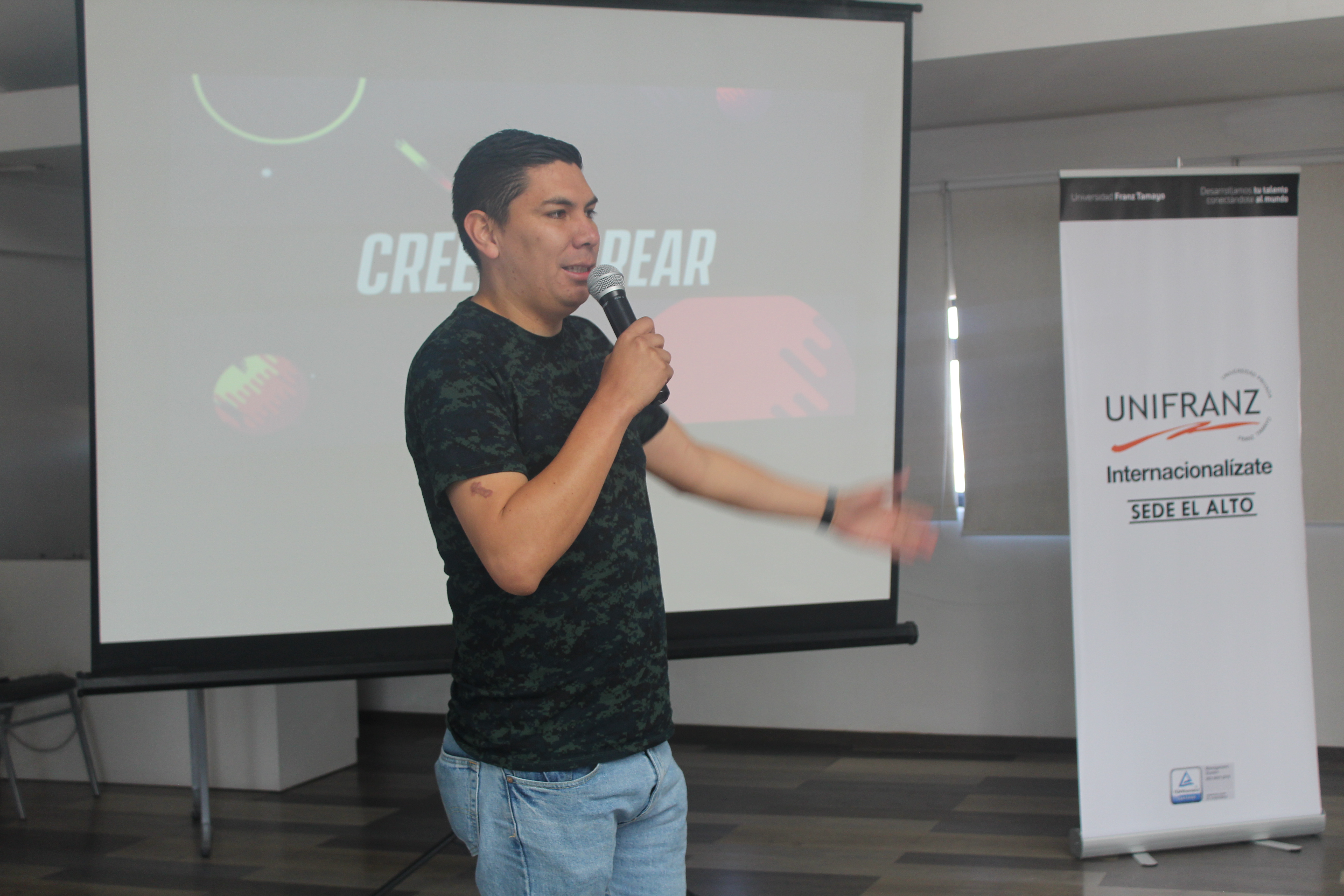 La Primera Jornada de Creatividad Activa comenzó con la exposición de Álvaro “Varo” Cuéllar, Coordinador Nacional Creativo UNIFRANZ, quien desarrolló la presentación “Creer y Crear”, Responsabilidad Social y ética en la creación de mensajes gráficos y audiovisuales. Durante la cual expuso sobre la creatividad a partir de los conceptos de “Creer” y “Crear”, donde “para trabajar en la creatividad de una campaña, primero hay que creer en ella”.