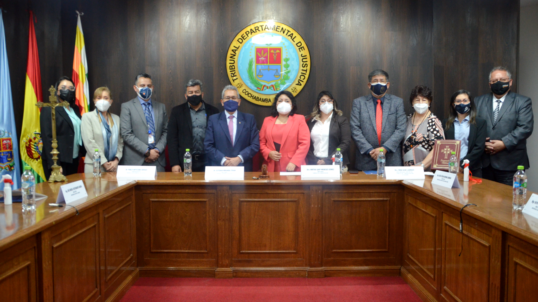 La ceremonia de firma de convenio se realizó en instalaciones del Salón Rojo del Tribunal Departamental de Justicia de Cochabamba, Participaron del evento la Dra. Mirtha Gaby Meneses, Decana de la Magistratura, Dr. Esteban Miranda, Decano del Tribunal Supremo de Justicia,
