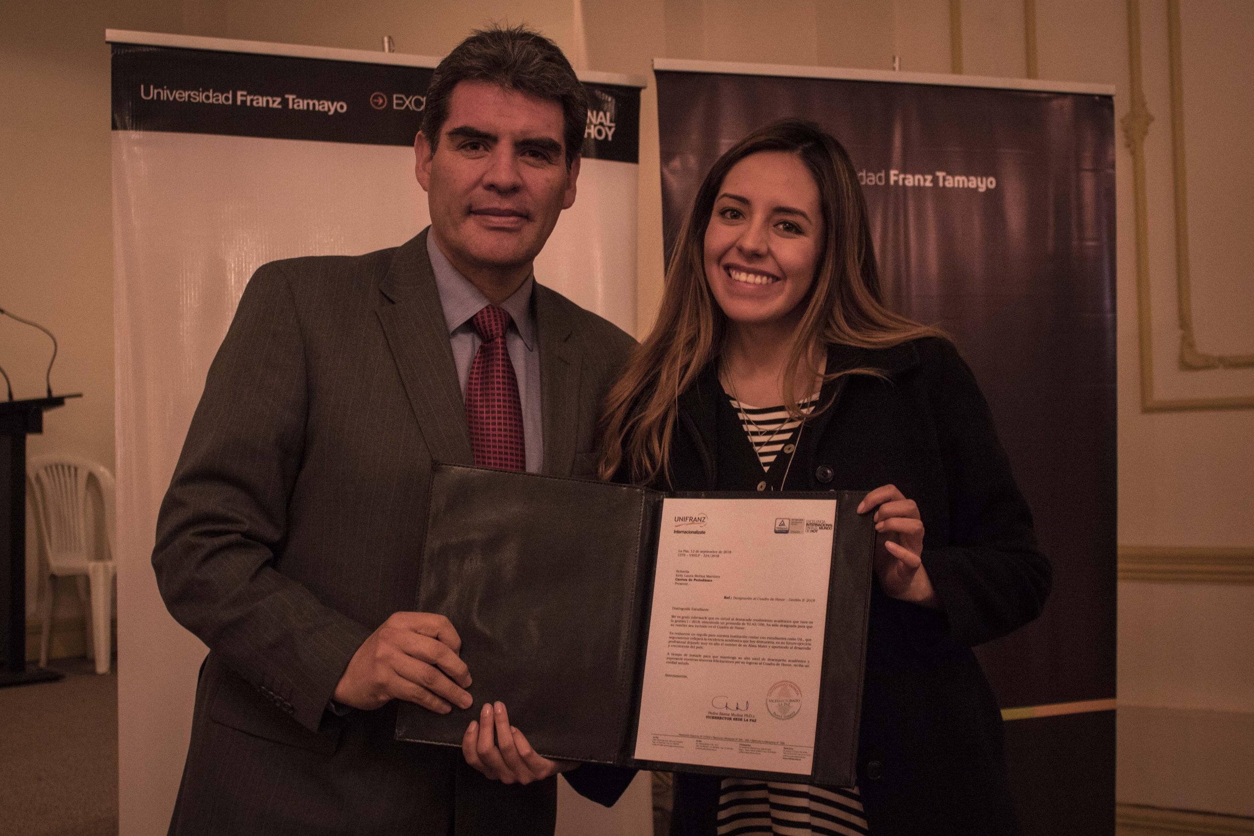 La Paz, Septiembre 2018. La Dirección de Bienestar Estudiantil de la Universidad Privada Franz Tamayo Sede La Paz, programó en el auditorio de UNIFRANZ Sede La Paz el reconocimiento a los estudiantes más sobresalientes de la gestión 1-2018, el mismo contó con la presencia de las principales autoridades.