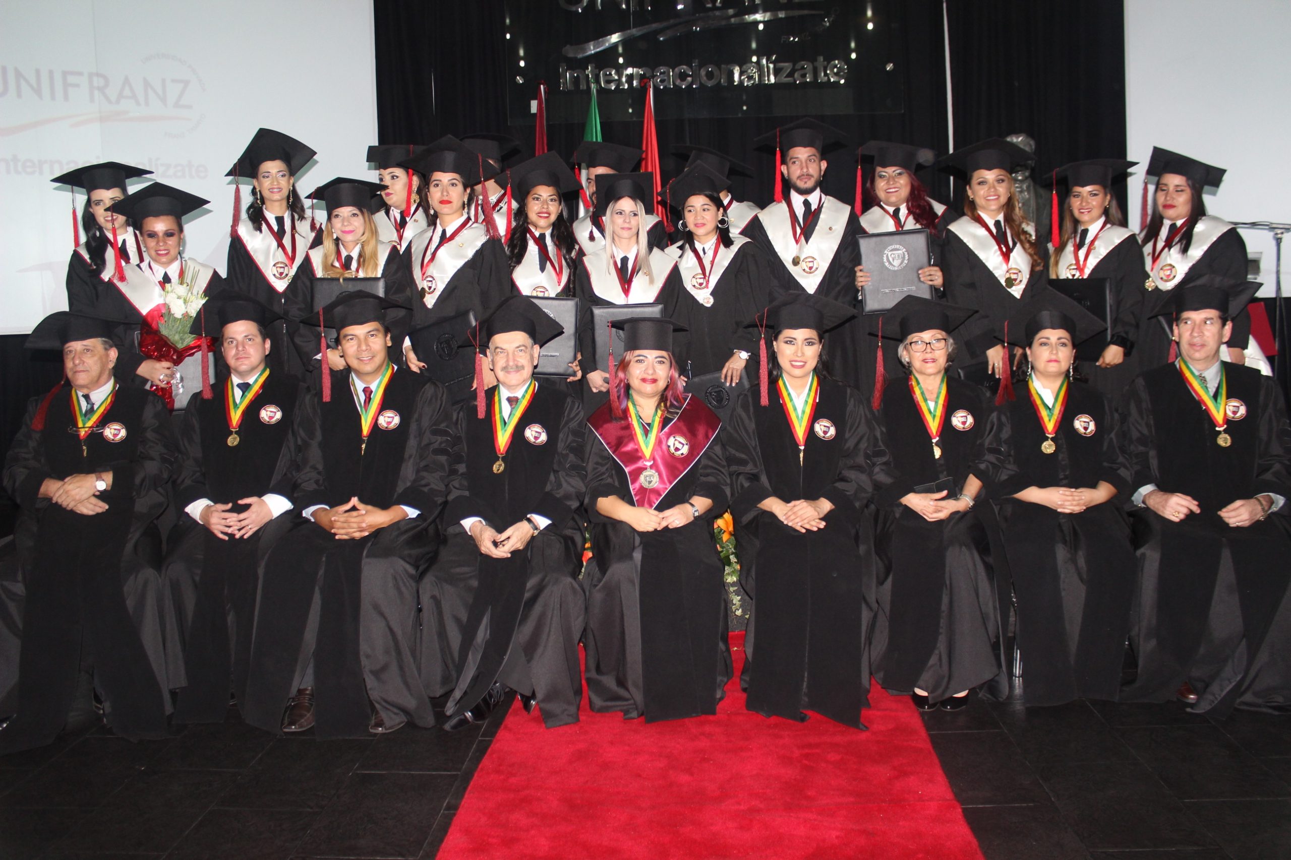 El directorio de la UNIFRANZ presidido por la Rectora Nacional Arq. DESA Verónica Ágreda de Pazos, el Vicerrector de la Sede el Dr. Carlos Dabdoub PHD, y el plantel académico a la cabeza del Decano Académico de la Sede, el Msc. Lic. Carlos Edwin Perrogón estuvieron presentes para recibir a la vida profesional a los graduados de las facultades de Diseño y Tecnologías Crossmedia, Facultad de Ciencias Económicas y Empresariales y la Facultad de Ciencias de la Salud de la Universidad.