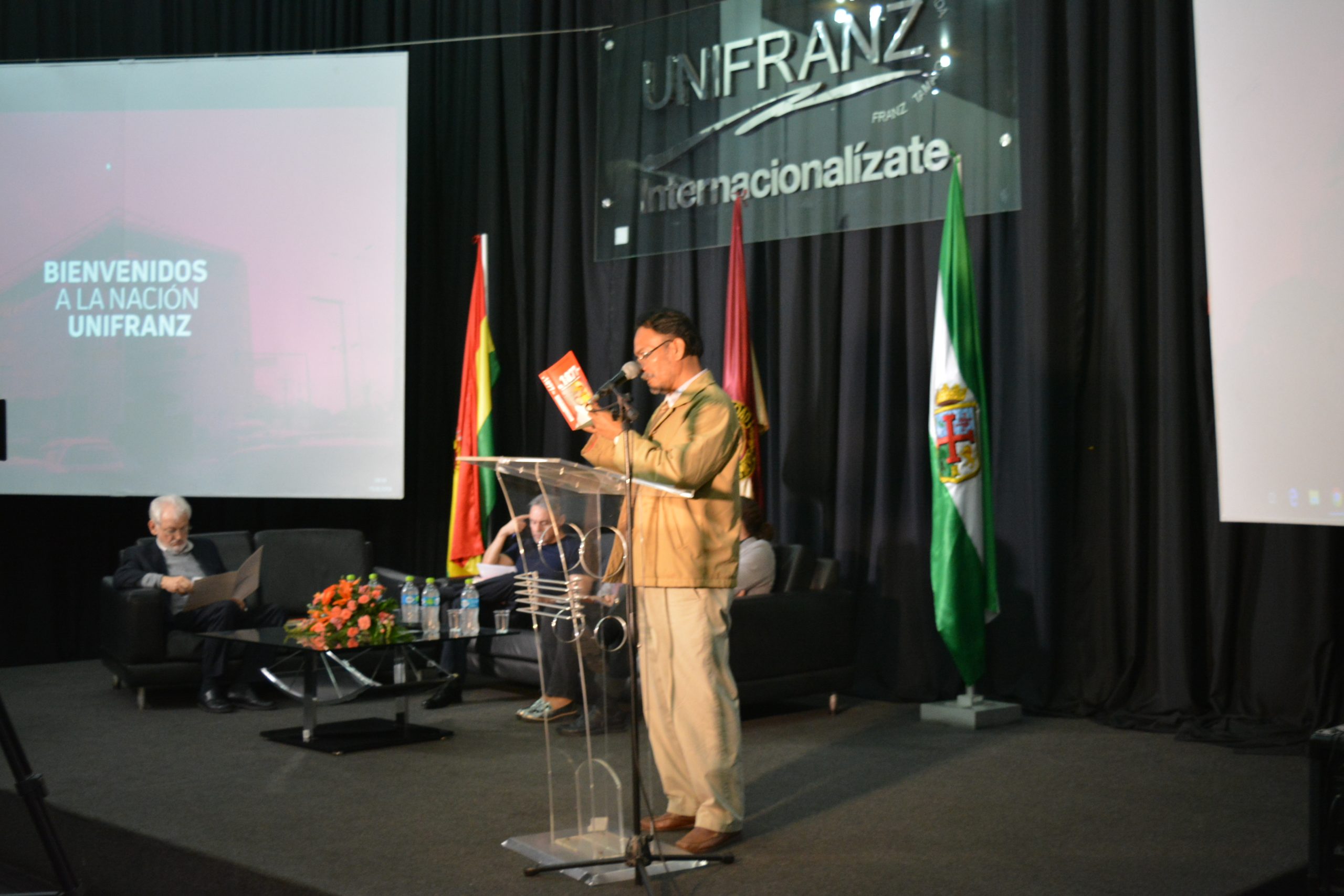 Agradeció la gentileza de la Sociedad de Estudios Geográficos e Históricos de Santa Cruz para la organización del evento, que se desarrolló en un auditorio a lleno total, con la presencia de familiares, amigos, estudiosos de la vida y obra de Antelo, además de autoridades, profesores y estudiantes de la UNIFRANZ.