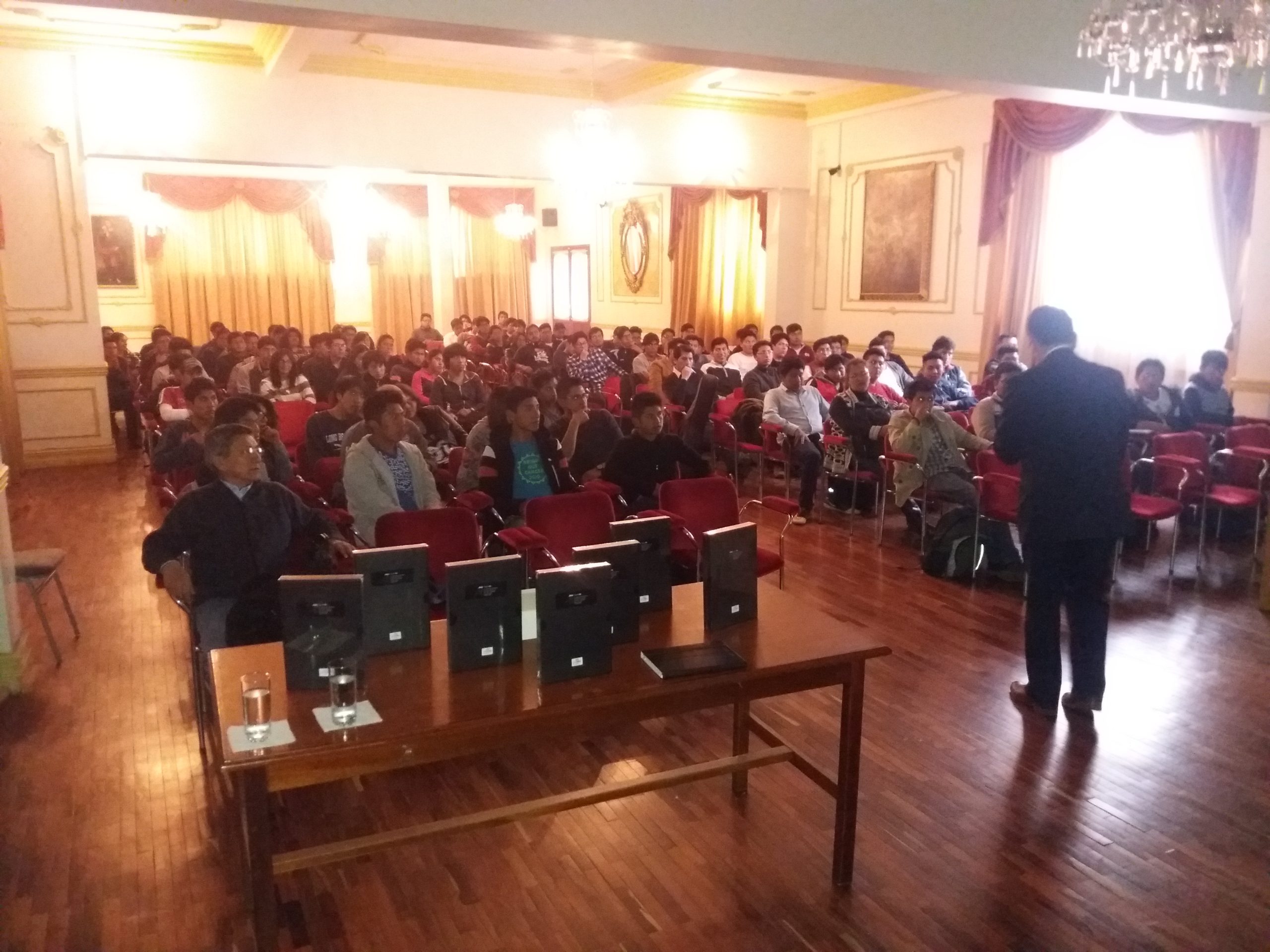 Durante su visita, en el Auditorio de la Universidad explicó e informó frente a mas de 150 estudiantes de la carrera de Ingeniería de Sistemas, de las sedes de El Alto y de La Paz, los alcances del convenio recientemente suscrito entre la Universidad Privada Franz Tamayo y Jalasoft, que es la empresa de software más grande de Bolivia y trabaja 100% exportando software comercial.