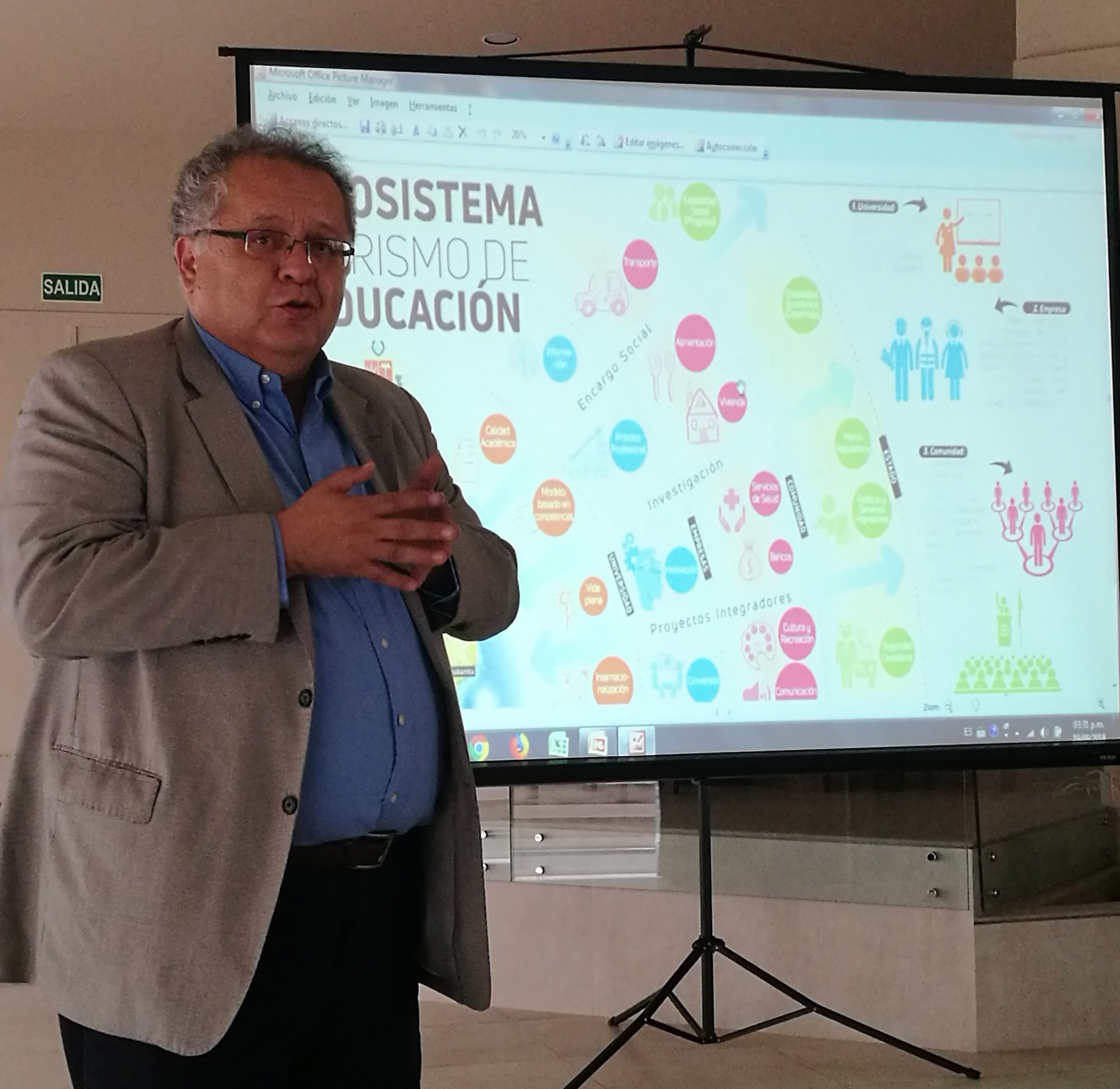 El Vicerrector de la Sede Cochabamba de la UNIFRANZ, Ing. Rolando López, aprovechó la oportunidad para exponer que Cochabamba tiene el poder del conocimiento y es la cuna de transformadores. Con esta introducción, explicó la propuesta de dicha casa superior de estudios denominada “Ecosistema de turismo de educación superior, una visión sistémica que involucra en distintas etapas a actores como las universidades, las empresas, la comunidad y el Estado. Los ejes transversales son la investigación, el encargo social, los proyectos integradores y el perfil profesional.