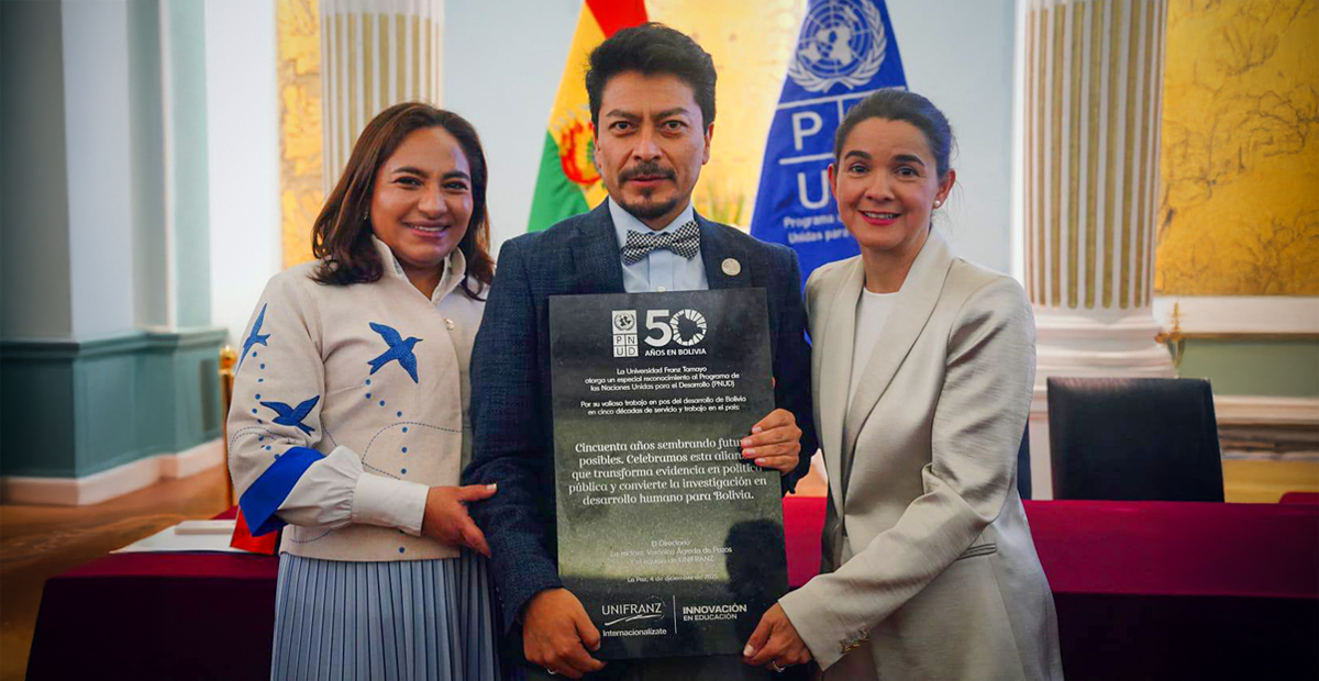 Bajo el mensaje “Cincuenta años sembrando futuros posibles”, la Universidad Franz Tamayo (Unifranz) otorgó un especial reconocimiento al Programa de las Naciones Unidas para el Desarrollo (PNUD), en homenaje al medio siglo de trabajo en Bolivia. La institución académica resaltó la trayectoria marcada por el aporte sostenido al desarrollo humano y el acompañamiento a las poblaciones más vulnerables del país.