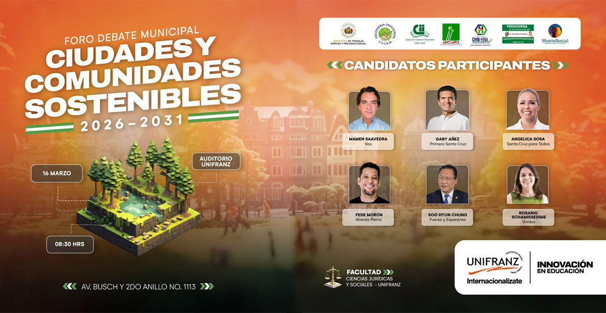 La comunidad estudiantil tendrá la oportunidad de escuchar, cuestionar y analizar de primera mano las propuestas de quienes buscan liderar la ciudad en los próximos años. La Universidad Franz Tamayo, Unifranz, será sede del Foro Debate Municipal Ciudades y Comunidades Sostenibles 2026–2031, un espacio pensado para reflexionar sobre el futuro urbano, ambiental y social de la ciudad.