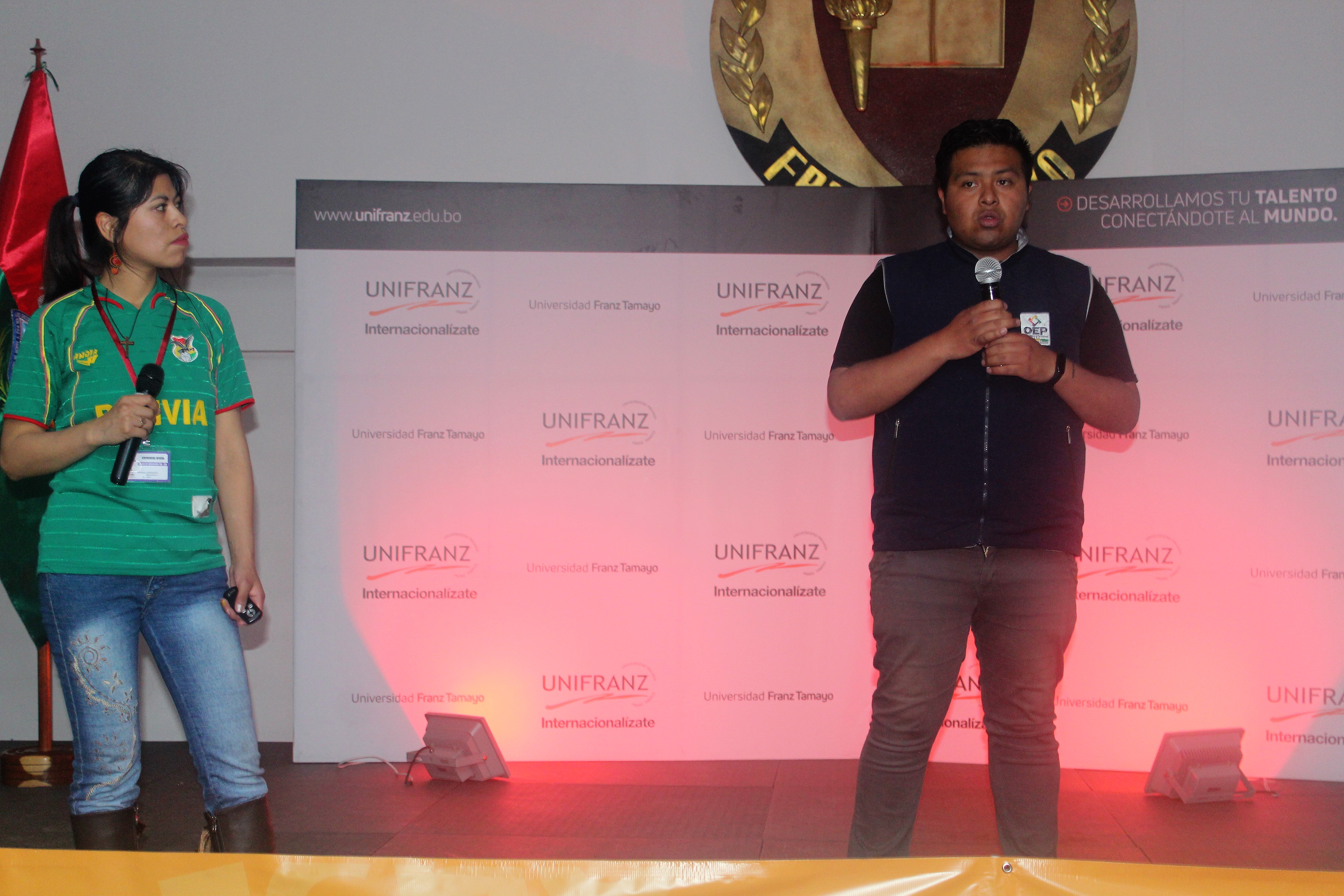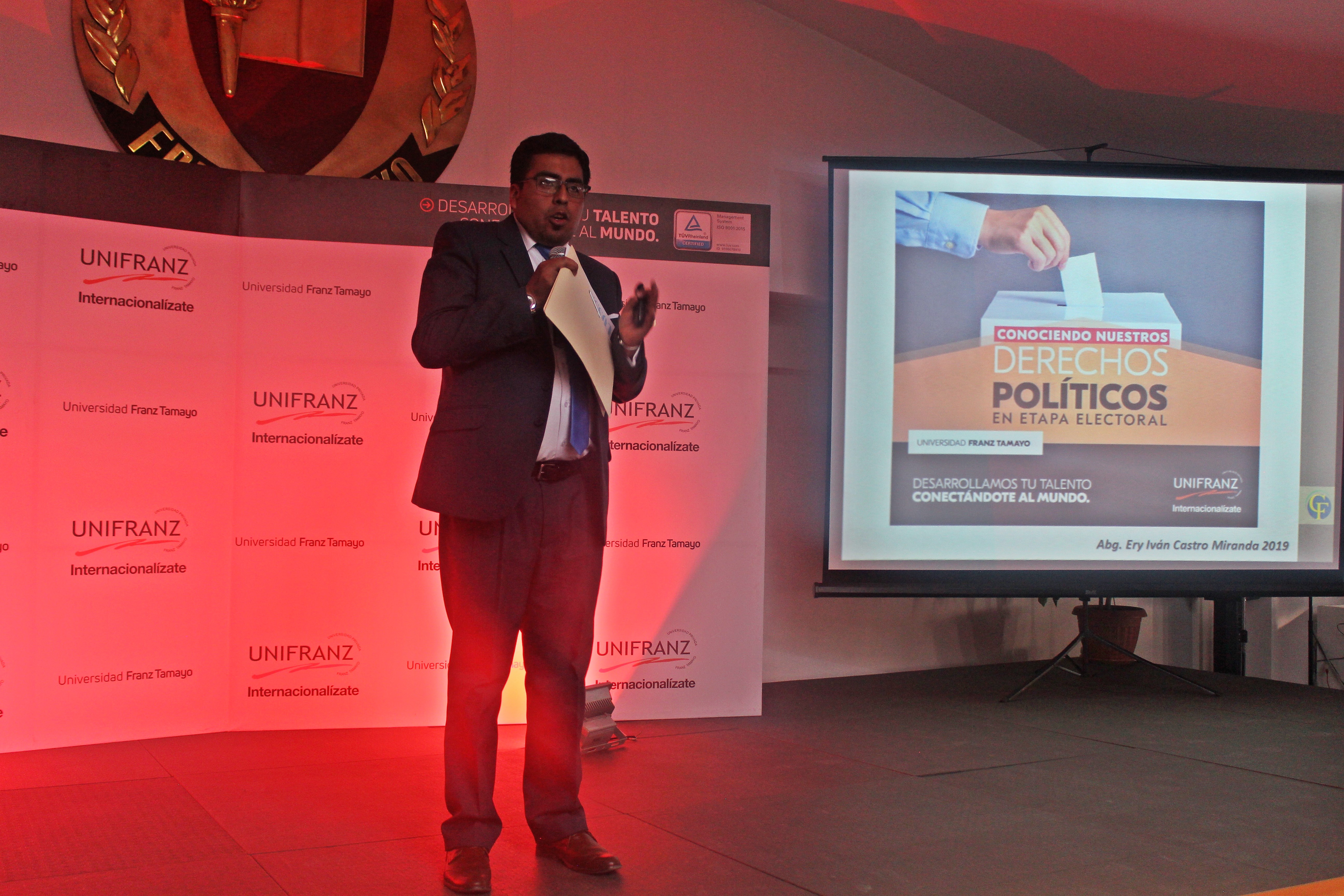 Las exposiciones estuvieron a cargo de Luis Fernando Arteaga, Docente UNIFRANZ experto en Derecho Electoral en UNIFRANZ El Alto; Medellyn Kelly Flores Aguilar, Enlace Educación TSE; Mauricio Ramos Paredes, Facilitador Departamental TSE y Ery Castro Miranda, Docente de Derecho Constitucional en UNIFRANZ.