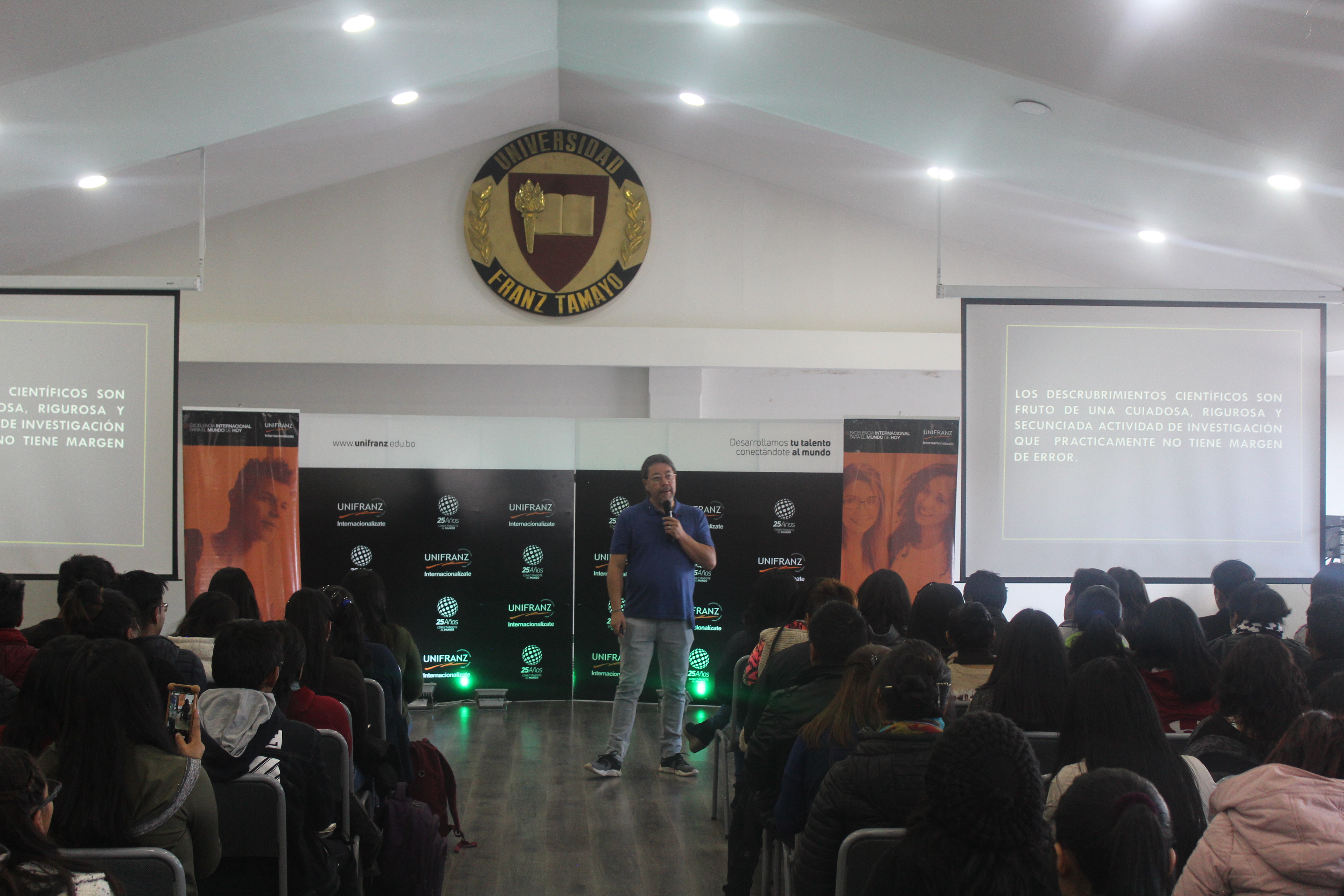 “Se ha llevado a cabo el evento con el objetivo de poder seleccionar ponentes que cuentan con amplio conocimiento y experiencia en el ámbito de la Metodología de la Investigación. Ellos han expuesto de una forma amena y sencilla qué es investigación y estamos seguros que los estudiantes saldrán de aquí con la idea de investigar con un fin claro: Yo quiero hacer ciencia”, explica Érika Febrero Condori, Docente tiempos completo de la Carrera de Derecho de UNIFRANZ.