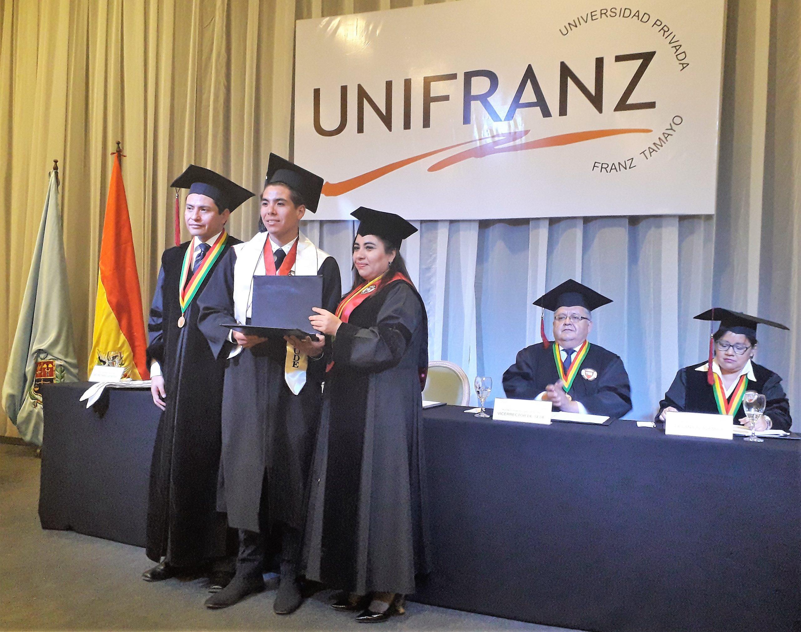 La Rectora Nacionalde UNIFRANZ, Arq. DESA Verónica Agreda, el Vicerrector Académico Nacional, Mgr.Erick Gustavo Montaño, el vicerrector de la sede, Ing. Rolando López, decanos y directores de carreras estuvieron presentes para otorgar los respectivos títulos a los graduados de las carreras de Bioquímica y Farmacia, Medicina, Administración de empresas, Ingeniería Comercial, Ingeniería de Sistemas, Publicidad y Marketing.