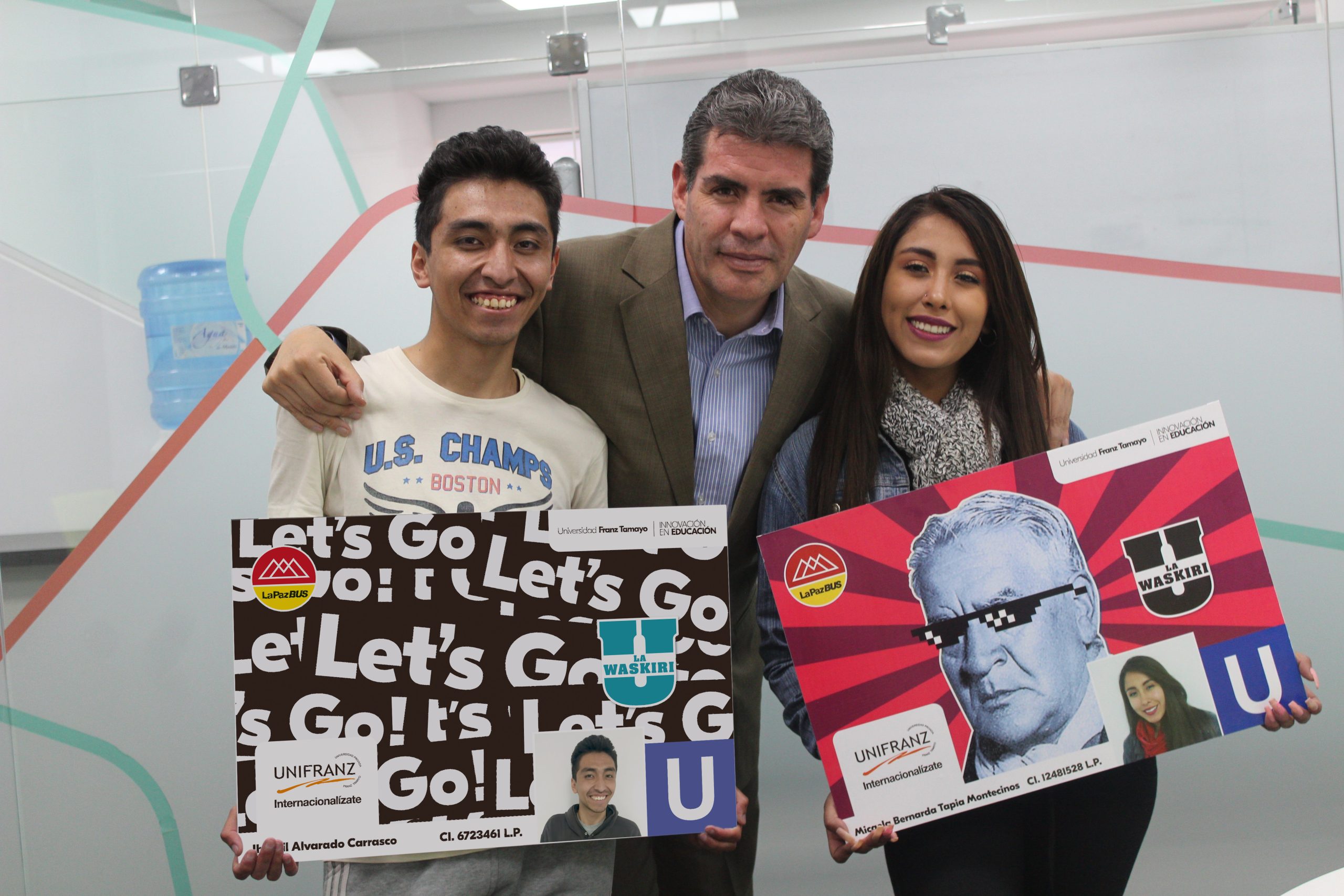 La Paz. Enero. UNIFRANZ y el Gobierno Autónomo Municipal de La Paz se unen para presentar oficialmente las nuevas tarjetas “La Waskiri” del Bus Puma Katari. Éstas vendrán con beneficio en las tarifas y tres espectaculares diseños acordes a la actitud de los jóvenes de hoy.